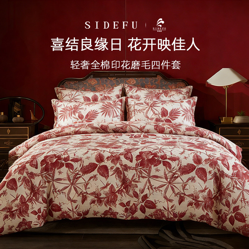 斯得福全棉提花磨毛床上四件套结婚红色婚床婚嫁婚庆喜被婚房陪嫁