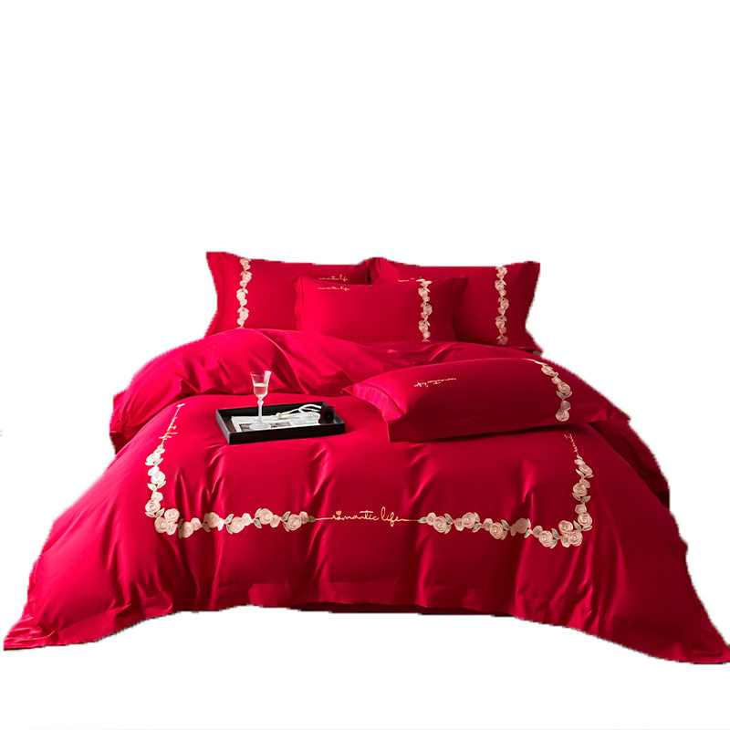 高档轻奢玫瑰结婚四件套红色纯棉婚庆喜被套新婚陪嫁床上用品婚房