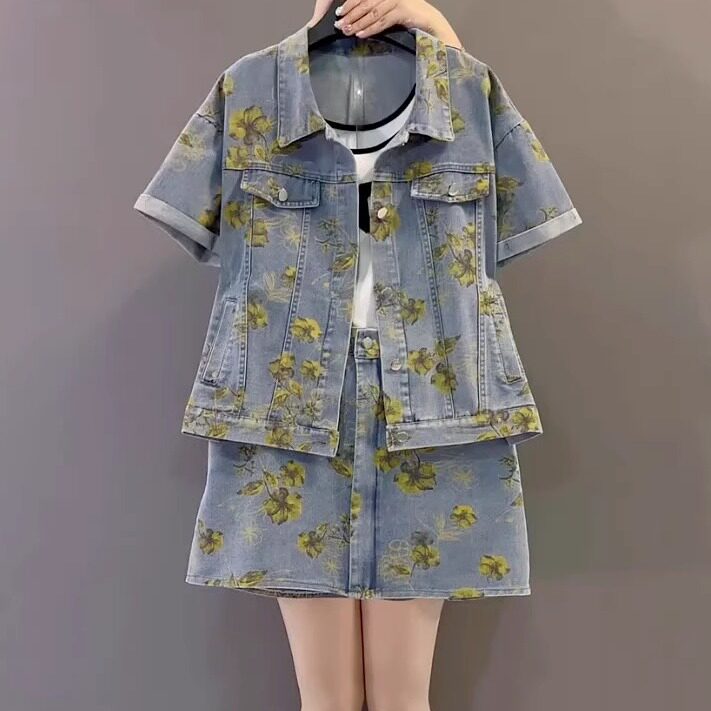复古碎花工装牛仔套装大码女装2025年宽松短袖短裤休闲裤裙两件套