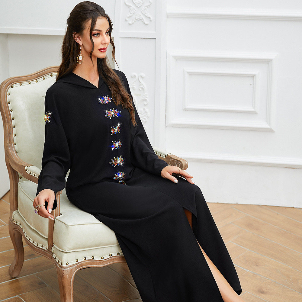 黑色喇叭袖7朵钻石花连衣裙中东迪拜旅游女装长裙连帽裙简约 重工