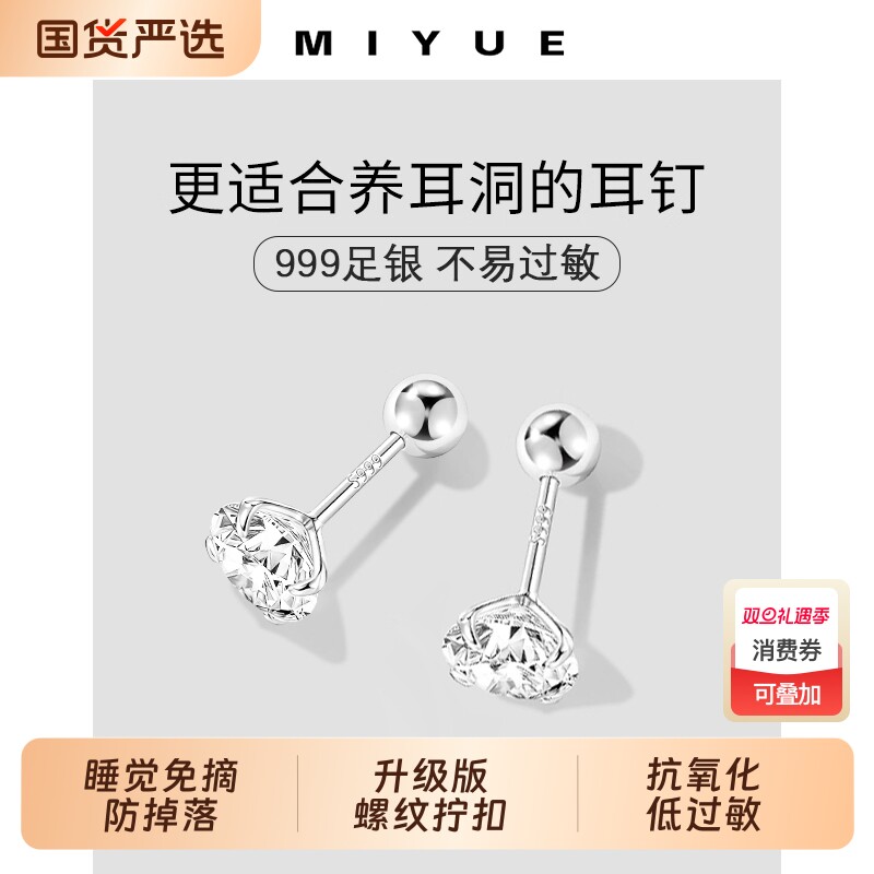 999纯银养耳洞钻石耳钉女养耳棒螺丝拧扣耳骨钉防堵针小耳环耳饰