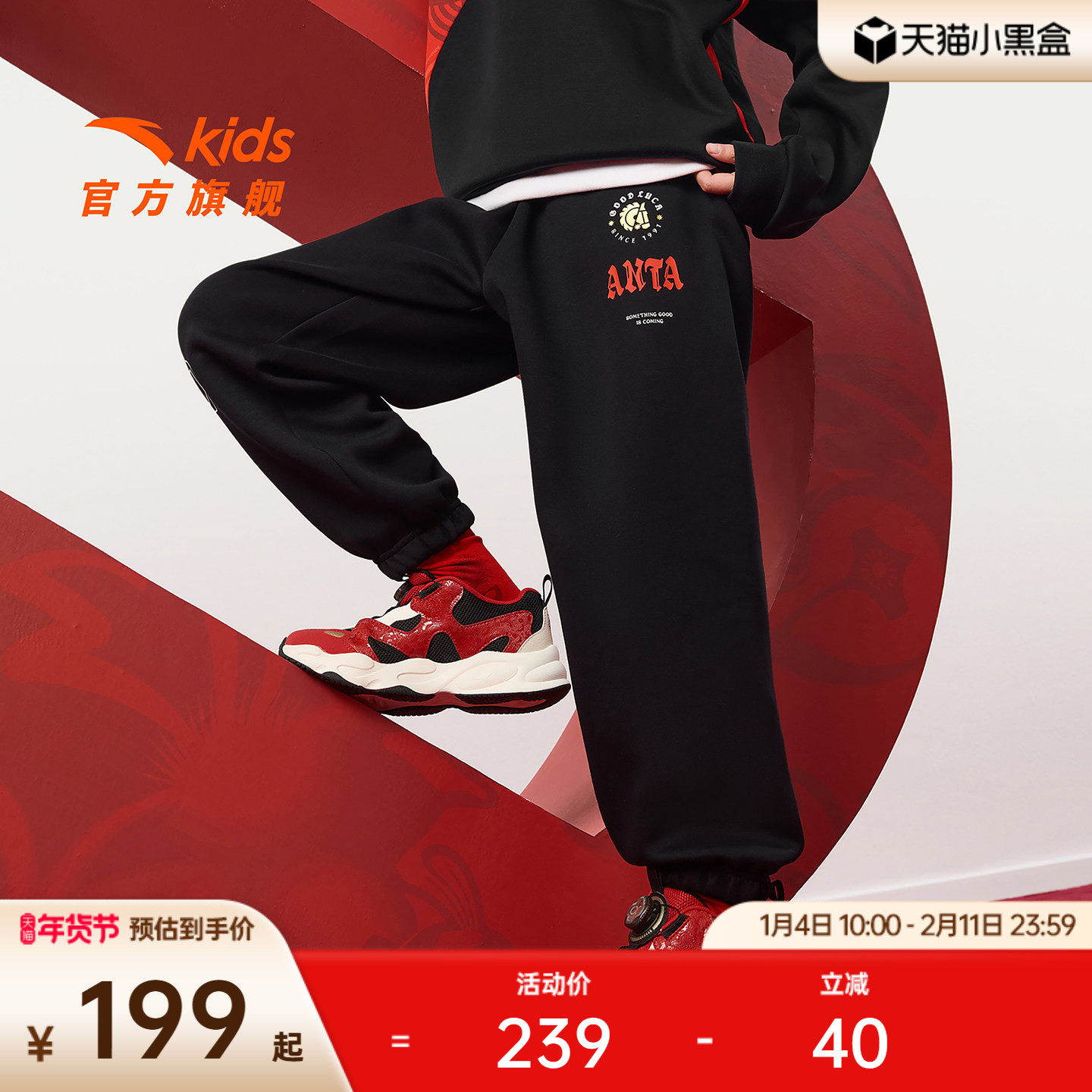 【马年新年红色】安踏儿童装男大童加绒运动裤子2026新款拜年衣服