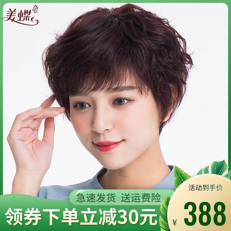 美禾 短发假发女全头套透气妈妈真发发套 时尚中老年短卷发假发套