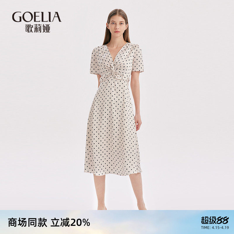 歌莉娅白色复古短袖连衣裙夏装女缎面冰丝法式波点气质V领长裙子