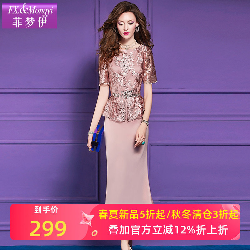 菲梦伊重工钉珠绣花连衣裙女夏装御姐轻熟风气质女神范鱼尾长裙子