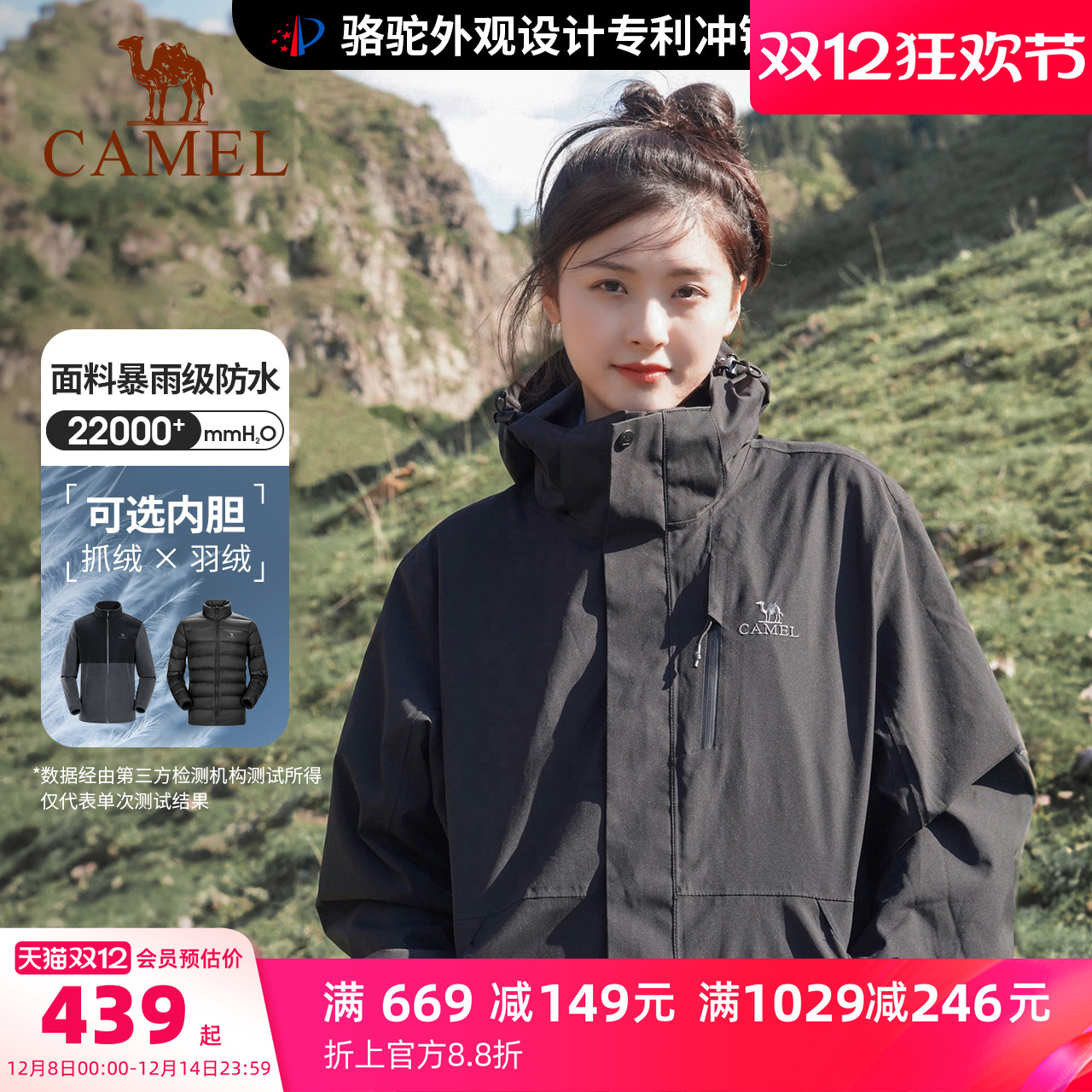 骆驼3514冲锋衣女三合一羽绒服黑色加厚外套男冬季户外防水登山服