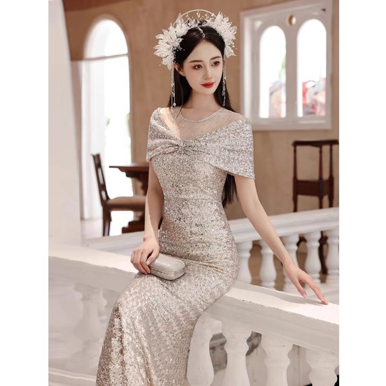鱼尾晚礼服裙女宴会高端轻奢气质新娘敬酒服订婚晨袍主持亮片高级