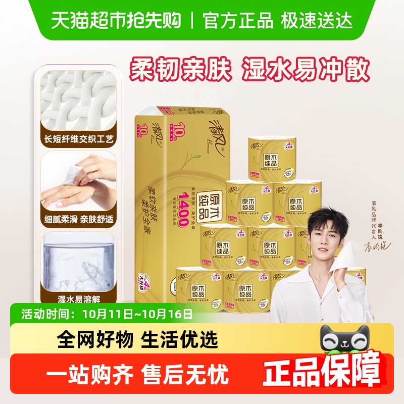 清风卷纸 卷筒纸卫生纸金装原木纯品 4层200克*10卷 卷筒式卫生纸