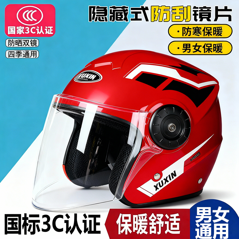 新款电动车摩托头盔男女通用3C认证四季半盔高清防雾保暖安全帽子