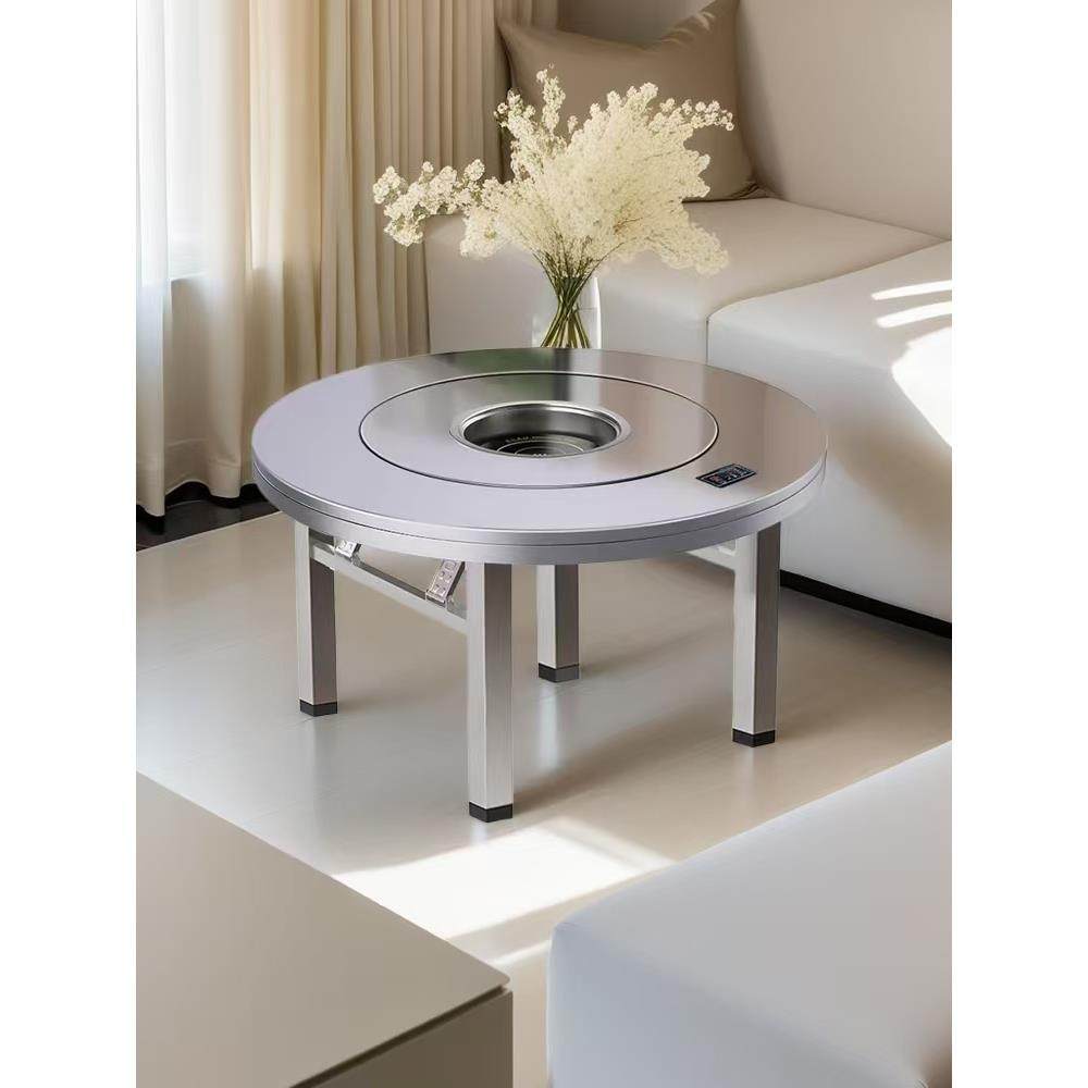 特厚不锈钢火锅桌带电磁炉一体内置转盘折叠桌圆桌餐厅酒席桌家用