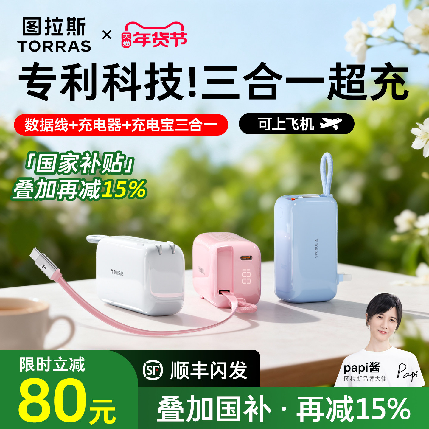 【papi酱同款】图拉斯三合一随心充3C认证充电宝器可上飞机2026新款快充能量棒适用苹果17移动电源自带线插头