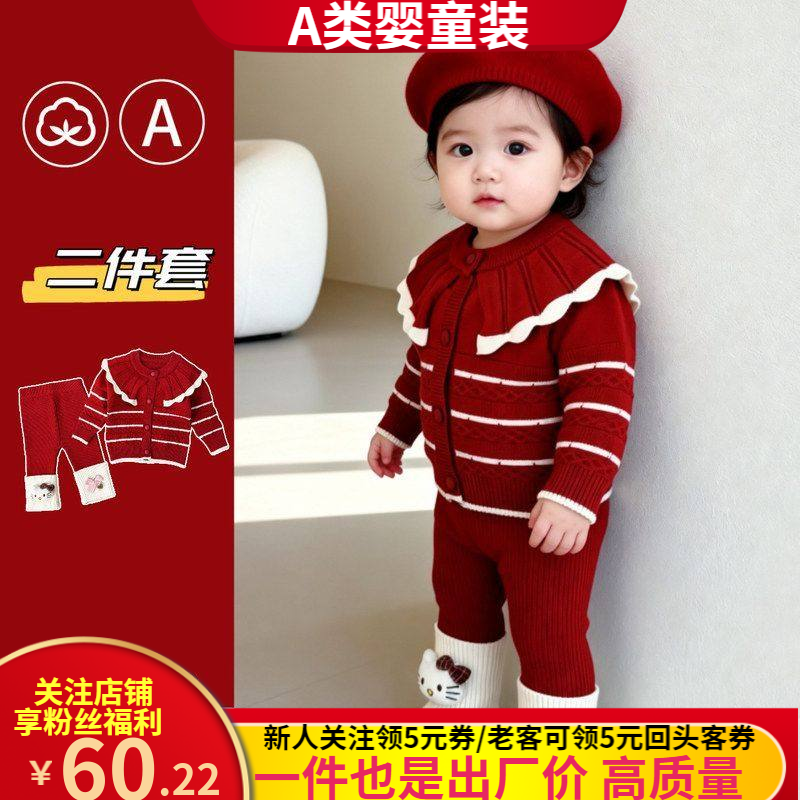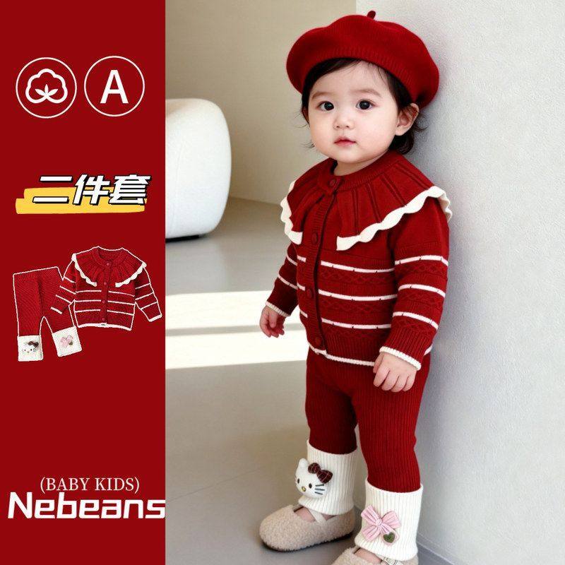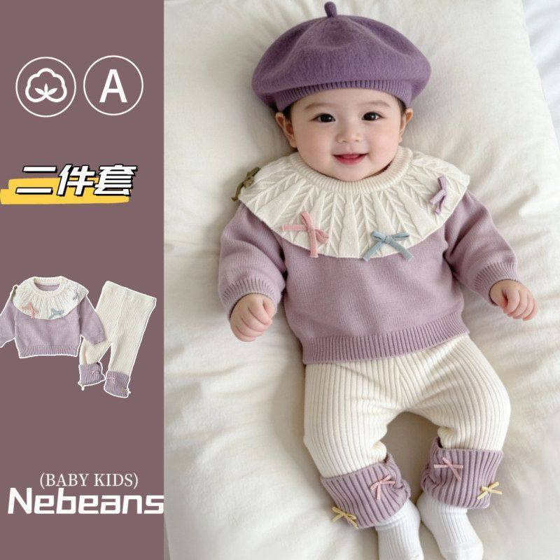 0-3岁秋冬针织毛线衣二件套韩版荷叶领女宝蝴蝶结娃娃领毛衣套装