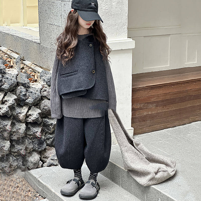 韩版儿童套装秋冬新款2024二件套女童毛呢马甲洋气韩版时髦呢子潮