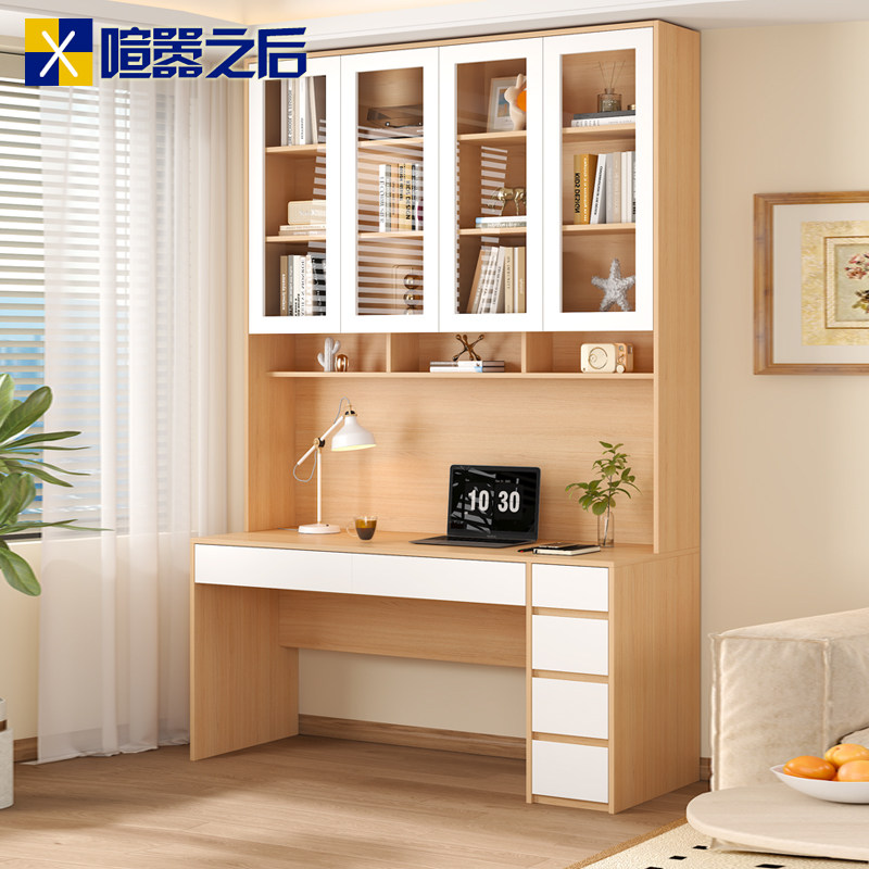 书桌书架一体桌双人轻奢办公桌带玻璃书柜电脑桌家用台式学习桌子