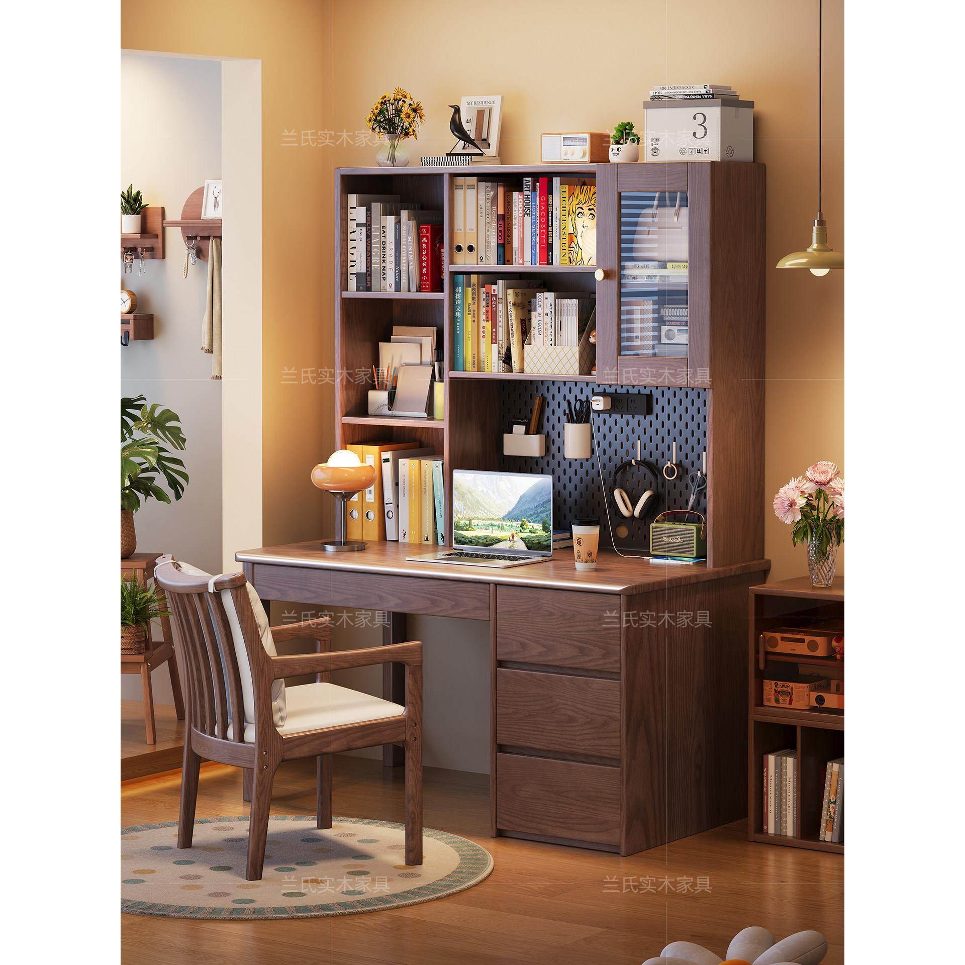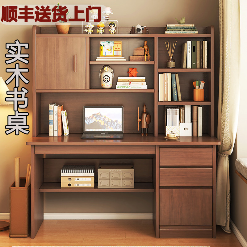 实木书桌学生家用学习写字台卧室书架一体桌子书柜靠墙成人电脑桌