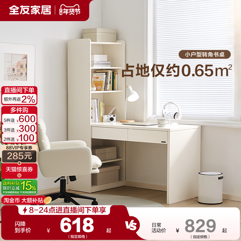 全友家居奶油风转角书桌客厅书柜书桌一体式卧室家用办公桌电脑桌