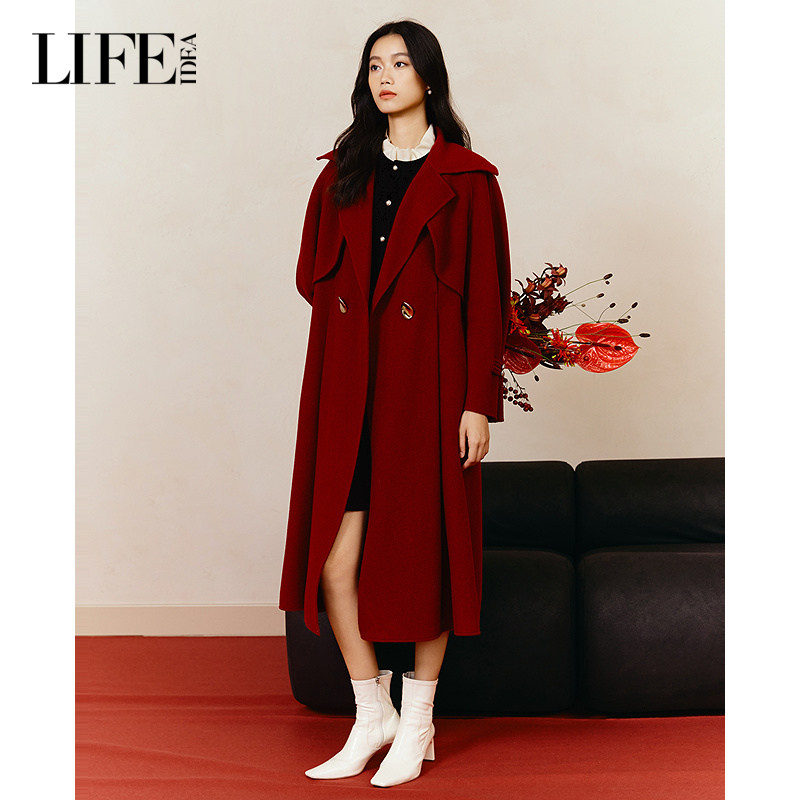LIFE·IDEA好运红长款毛呢大衣女双排扣直筒外套秋冬保暖显瘦外套