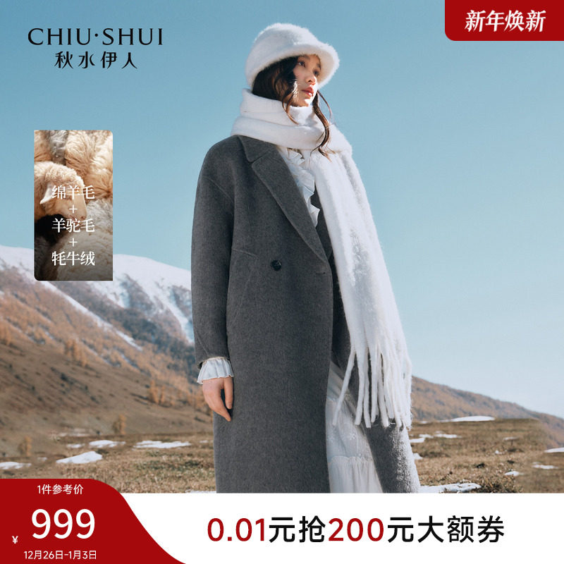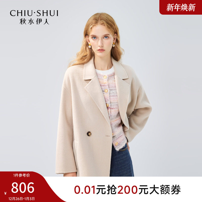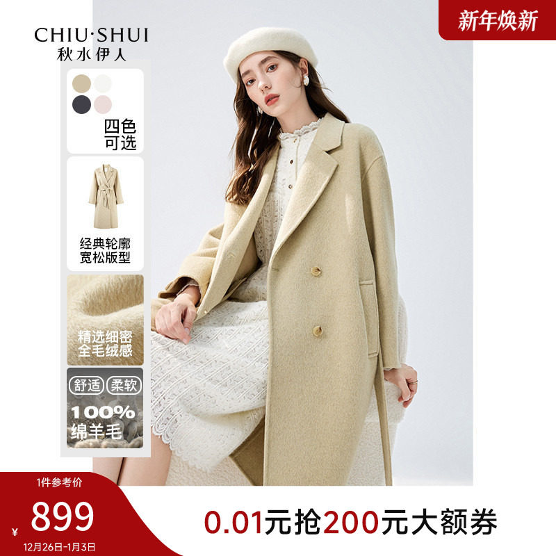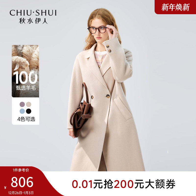 秋水伊人100%绵羊毛气质大衣2025年冬季新款女装直筒中长西装外套
