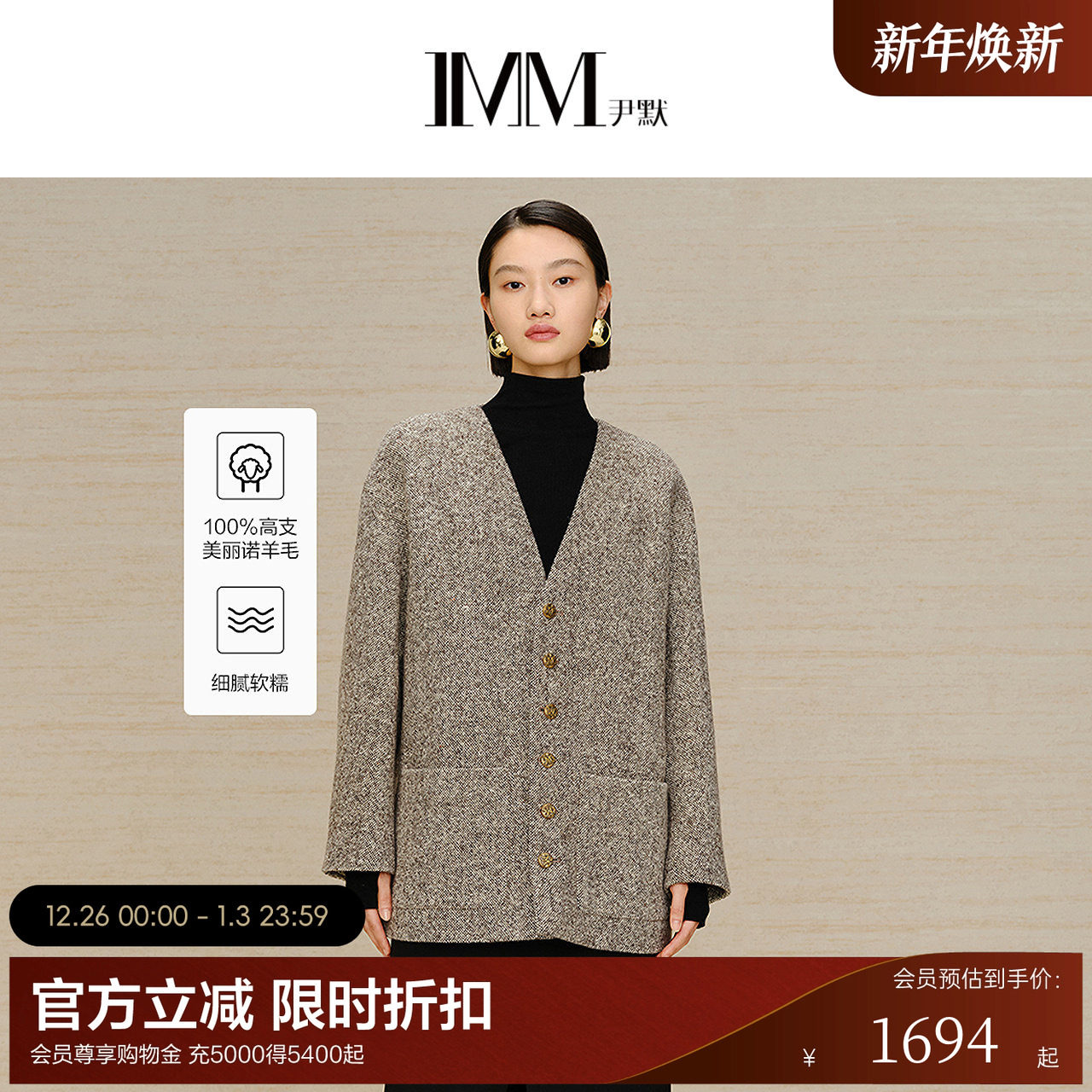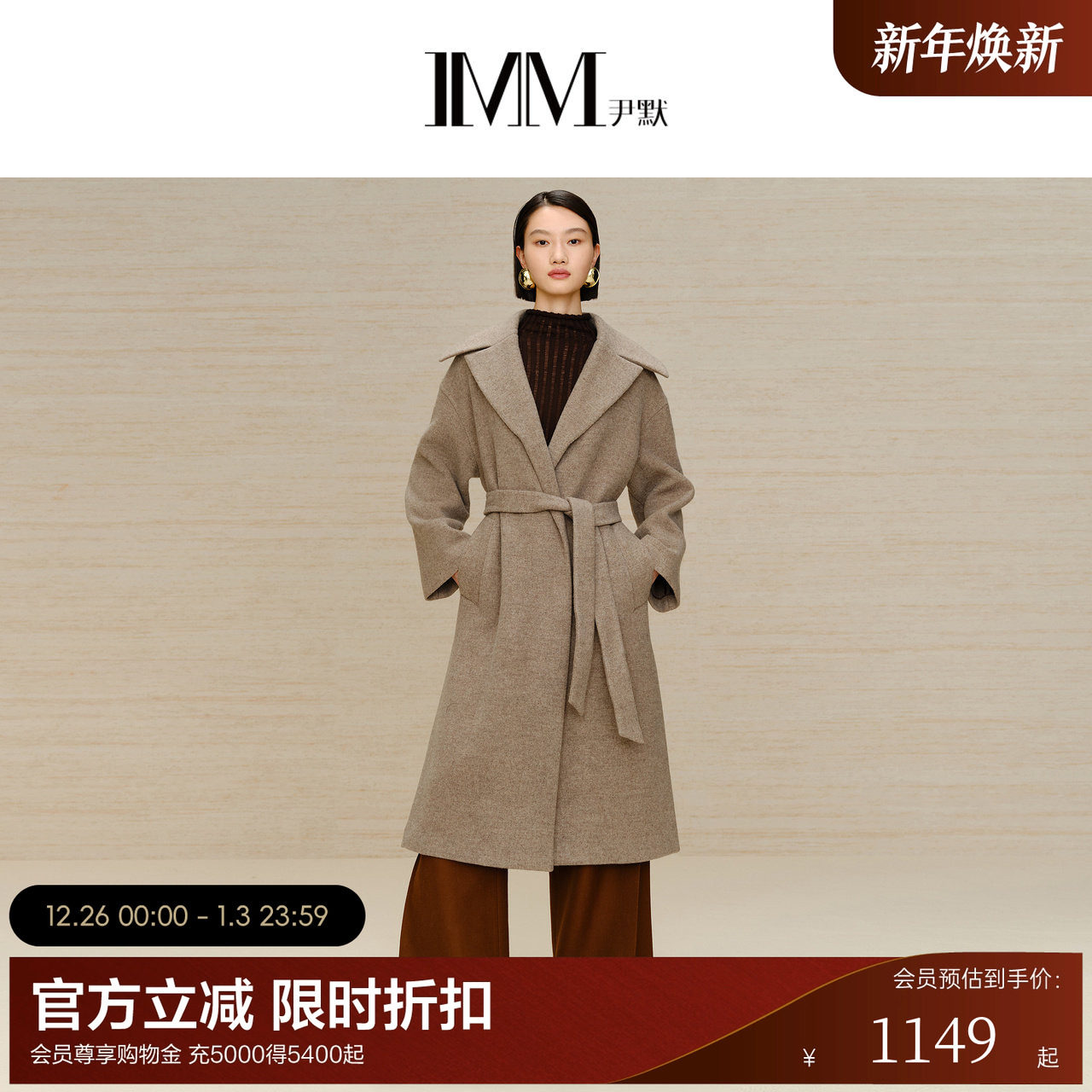 商场同款IMM尹默女装100%羊毛气质百搭V领直筒一手长毛呢大衣外套