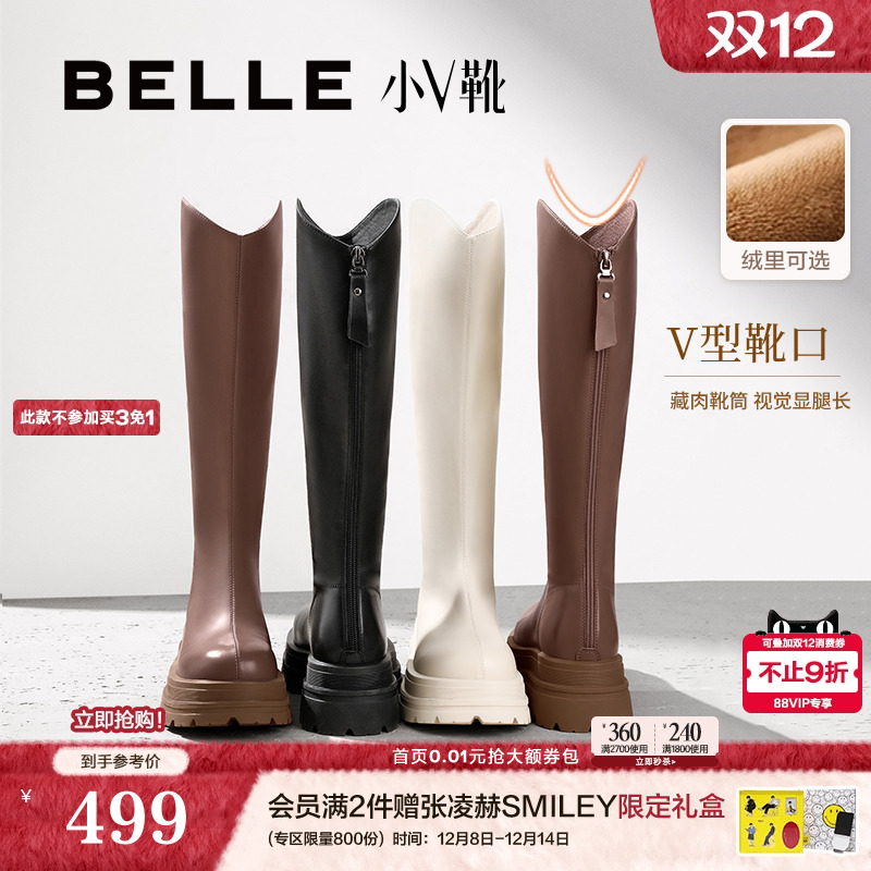 白鹿同款百丽小V靴弹力靴加绒冬季厚底骑士长筒靴女靴A1V1DDG3