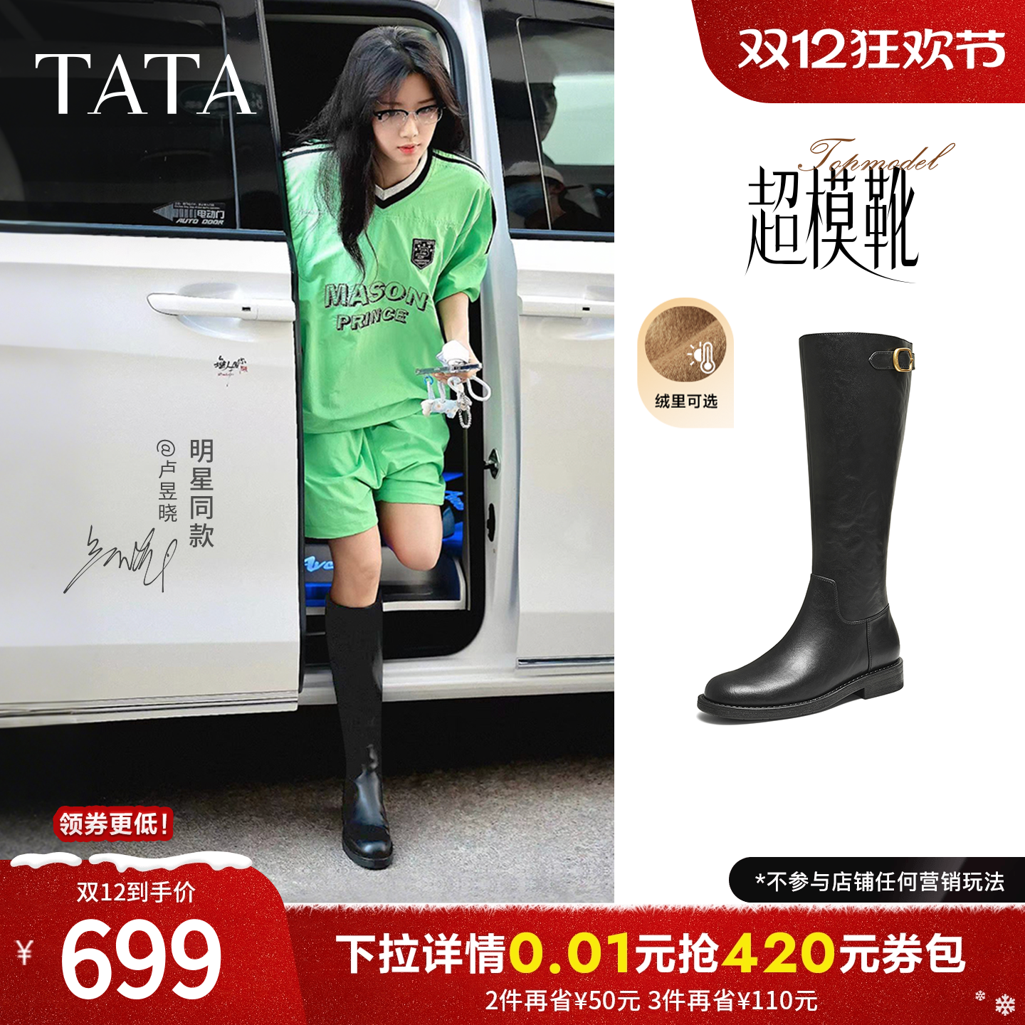 卢昱晓同款TATA他她超模靴骑士靴大筒围显瘦长靴加绒靴子7TGA8DG5