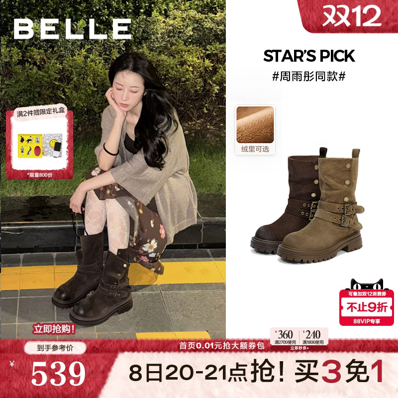 周雨彤同款百丽西部派对厚底牛仔西部靴女靴子棉鞋中筒靴B2824DZ5