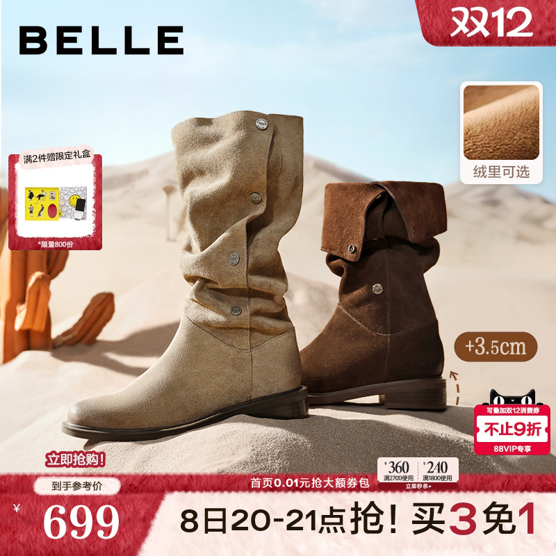 吴千语同款百丽女靴荒野来信西部牛仔靴加绒雪地靴长筒靴3QFC3DG5