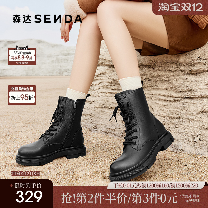 森达真皮马丁靴女冬款商场同款时尚英伦绒里厚底工装中筒靴XEC01