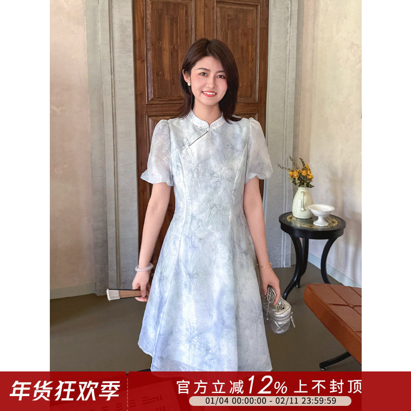 紫璐莱如初颜~新中式国风盘扣改良旗袍短裙泡泡袖印花连衣裙女83X