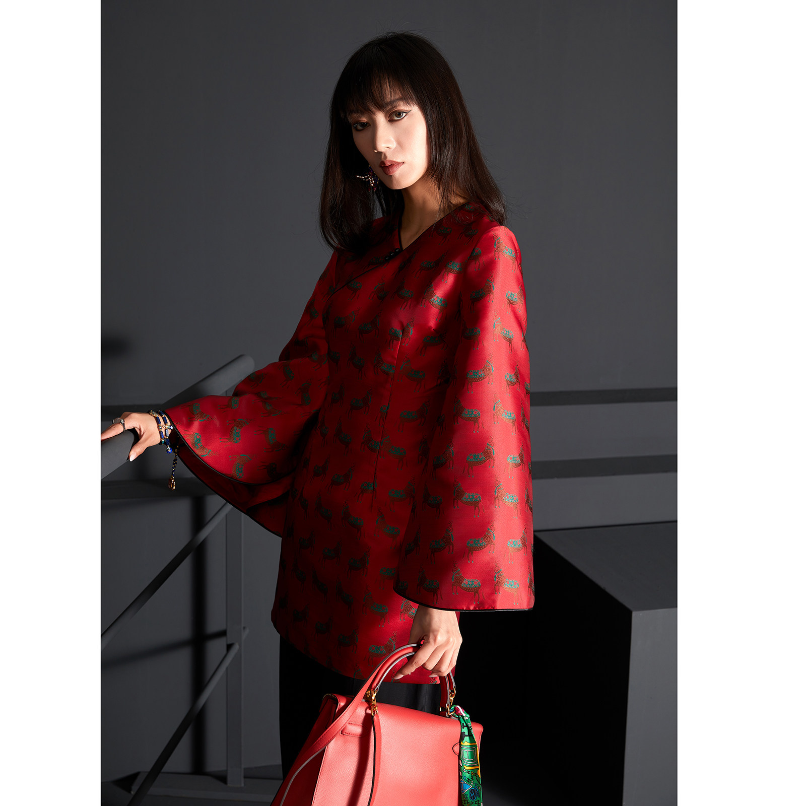 扶郎2024设计师原创店 新款日系和风 喇叭袖提花红色少女旗袍短裙