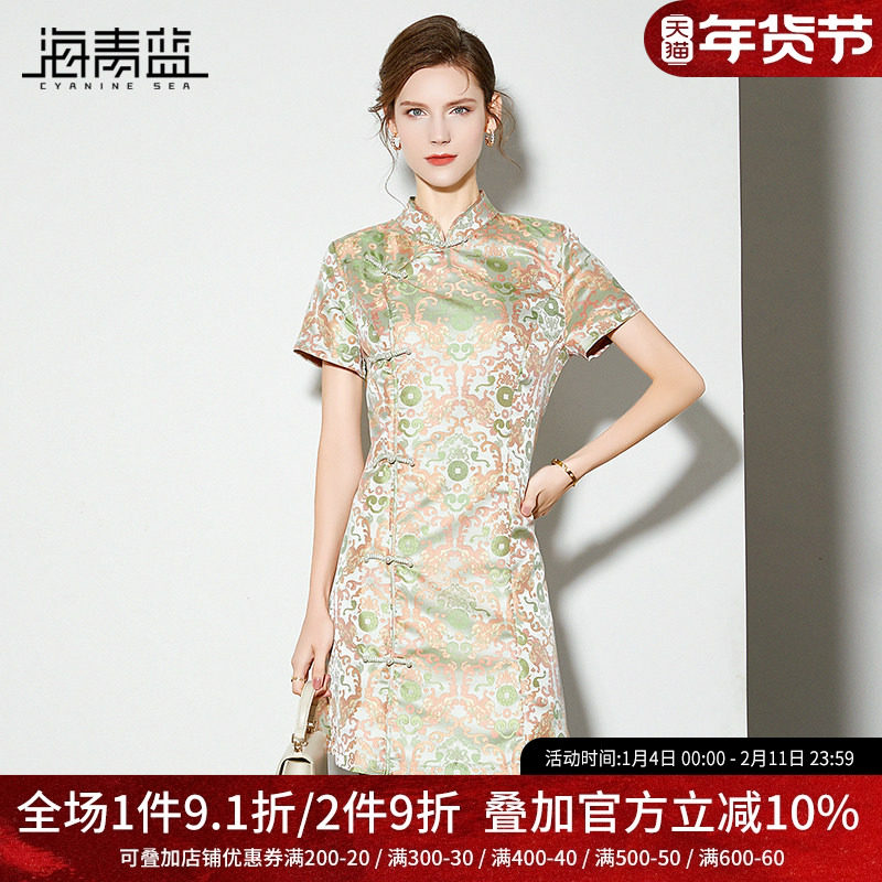 海青蓝提花新中式连衣裙女短袖2025夏季国风修身气质改良旗袍短裙