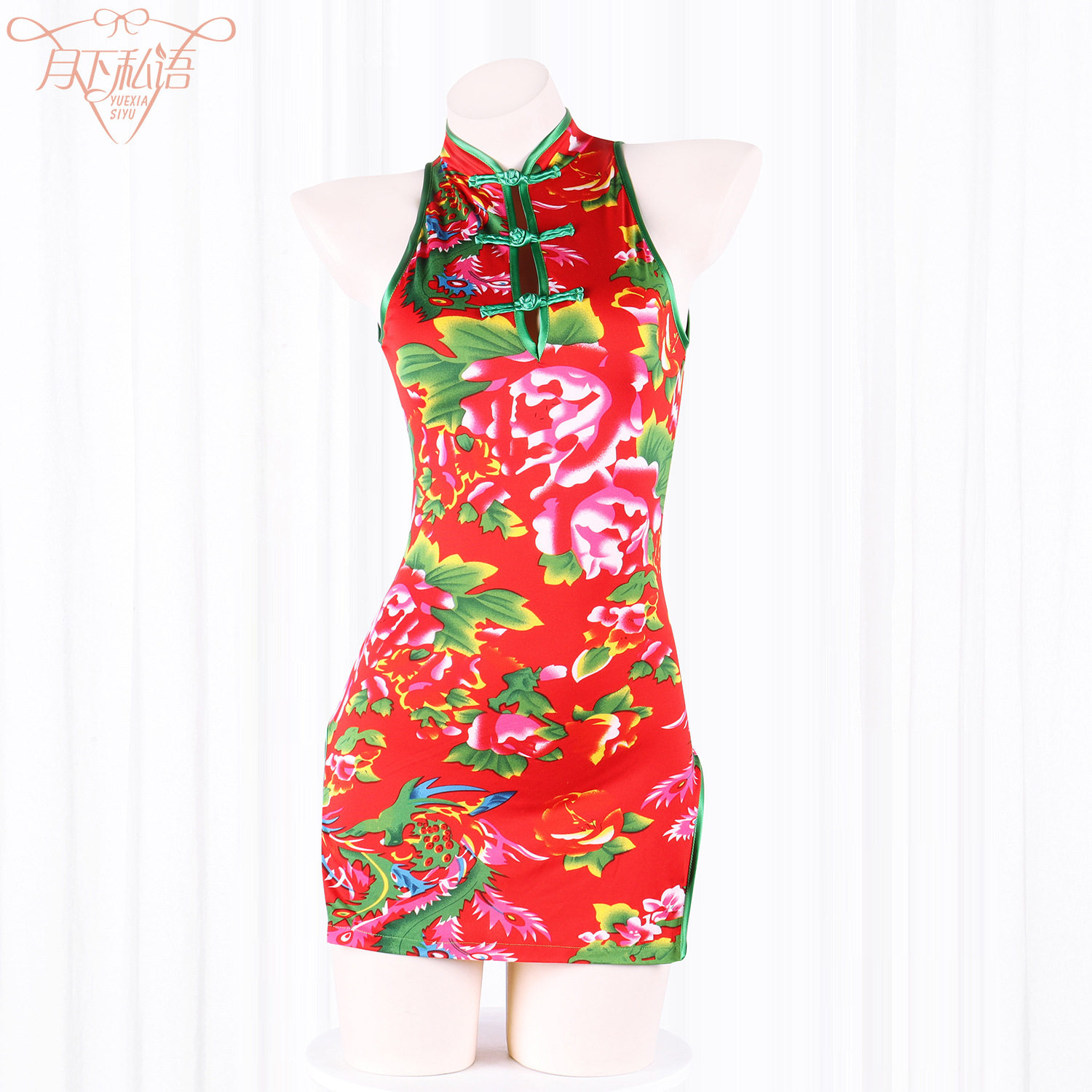 漫野玫瑰》纯欲一字领透视开叉旗袍短裙性感睡衣套装女私房家居服