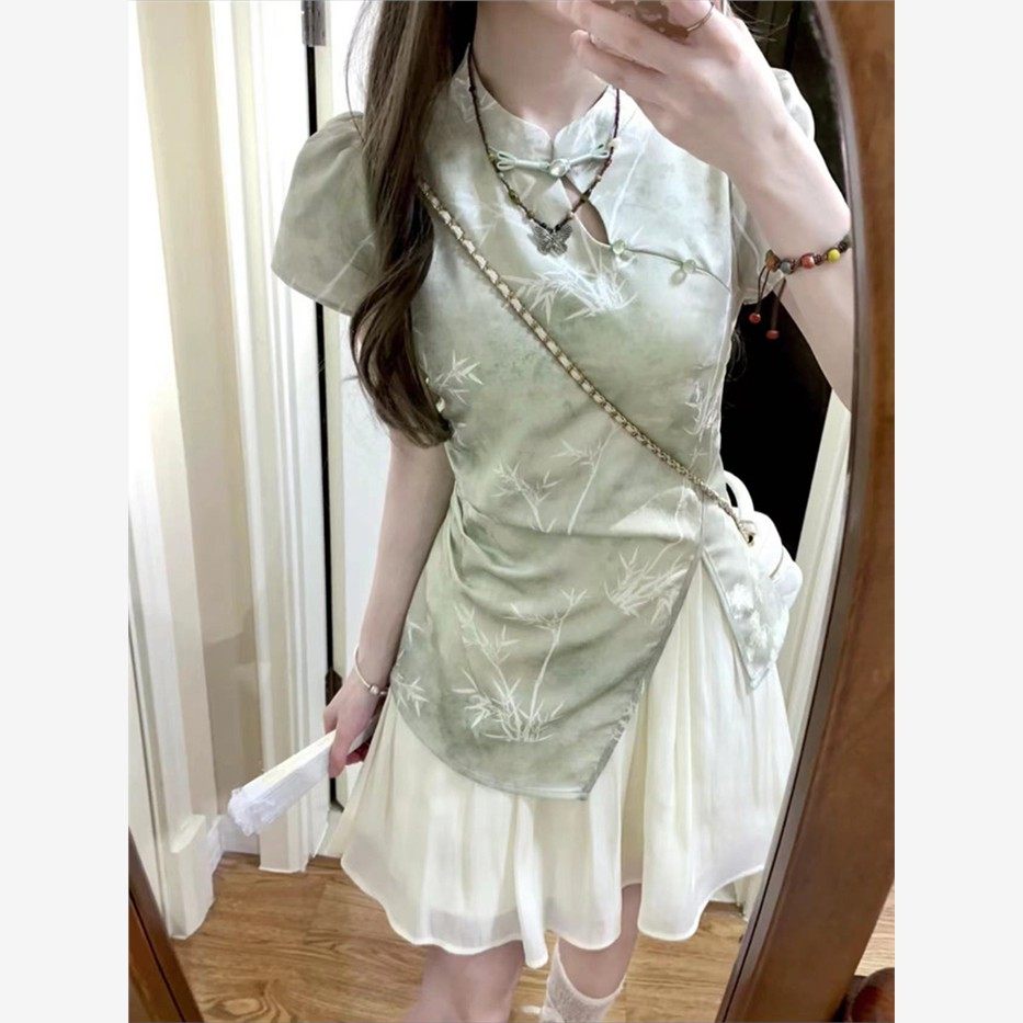 新中式国风清冷绿色假两件连衣裙女夏收腰不规则拼接改良旗袍短裙