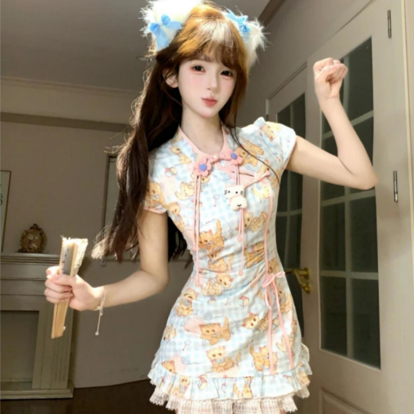 新中式国风甜美收腰显瘦连衣裙女2025夏季蕾丝拼接少女风旗袍短裙