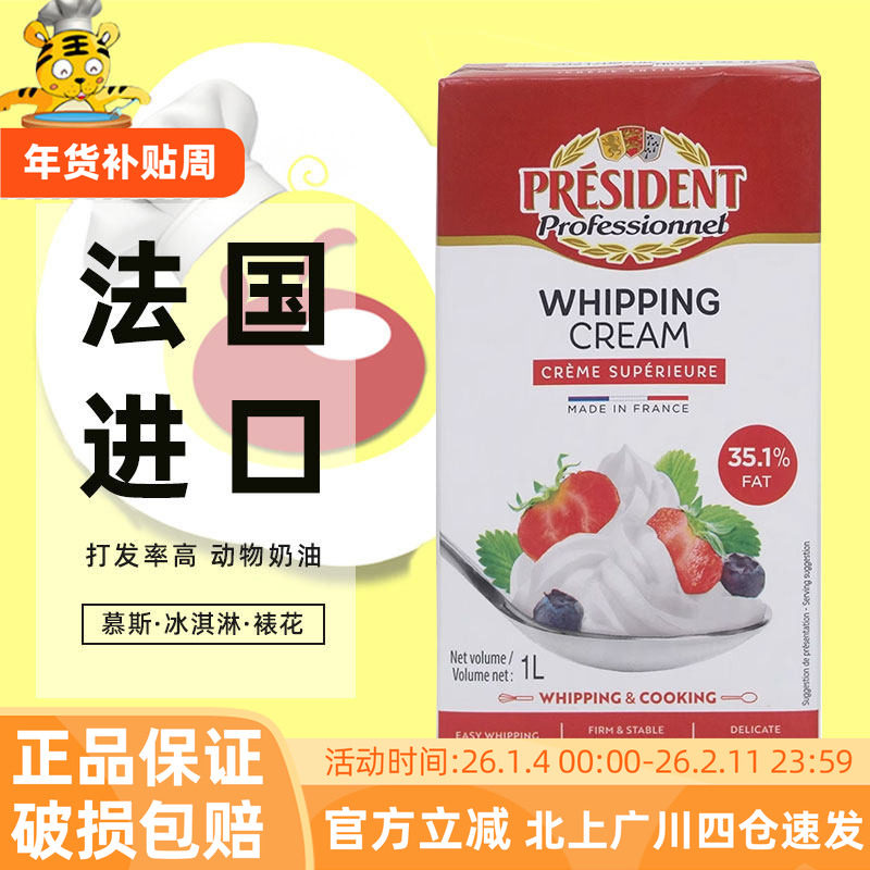 总统淡奶油1L动物性蛋糕裱花材料稀奶油家用商用法国进口烘焙原料