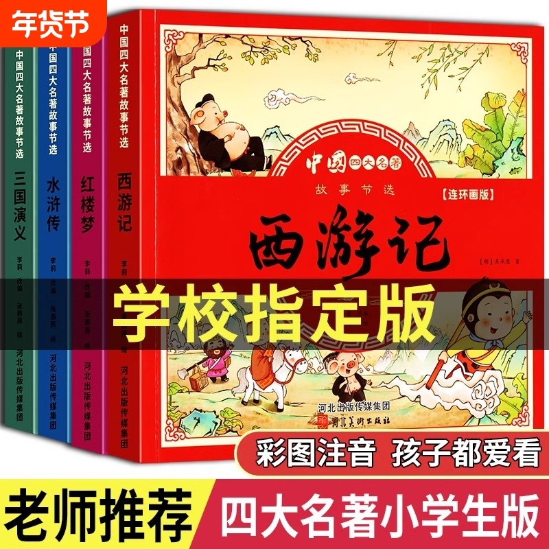 四大名著连环画西游记儿童绘本漫画版小学生全套4册彩图注音三国演义水浒传红楼梦幼小衔接经典阅读小人书一二三年级课外阅读书籍