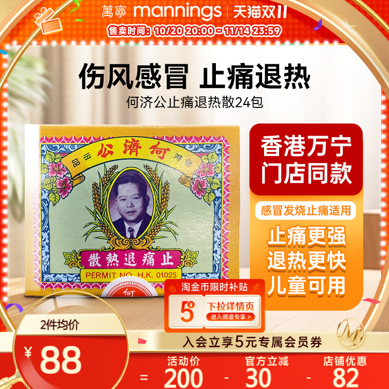 万宁何济公香港止痛退热散对乙酰氨基酚止疼头痛牙痛感冒正品24包
