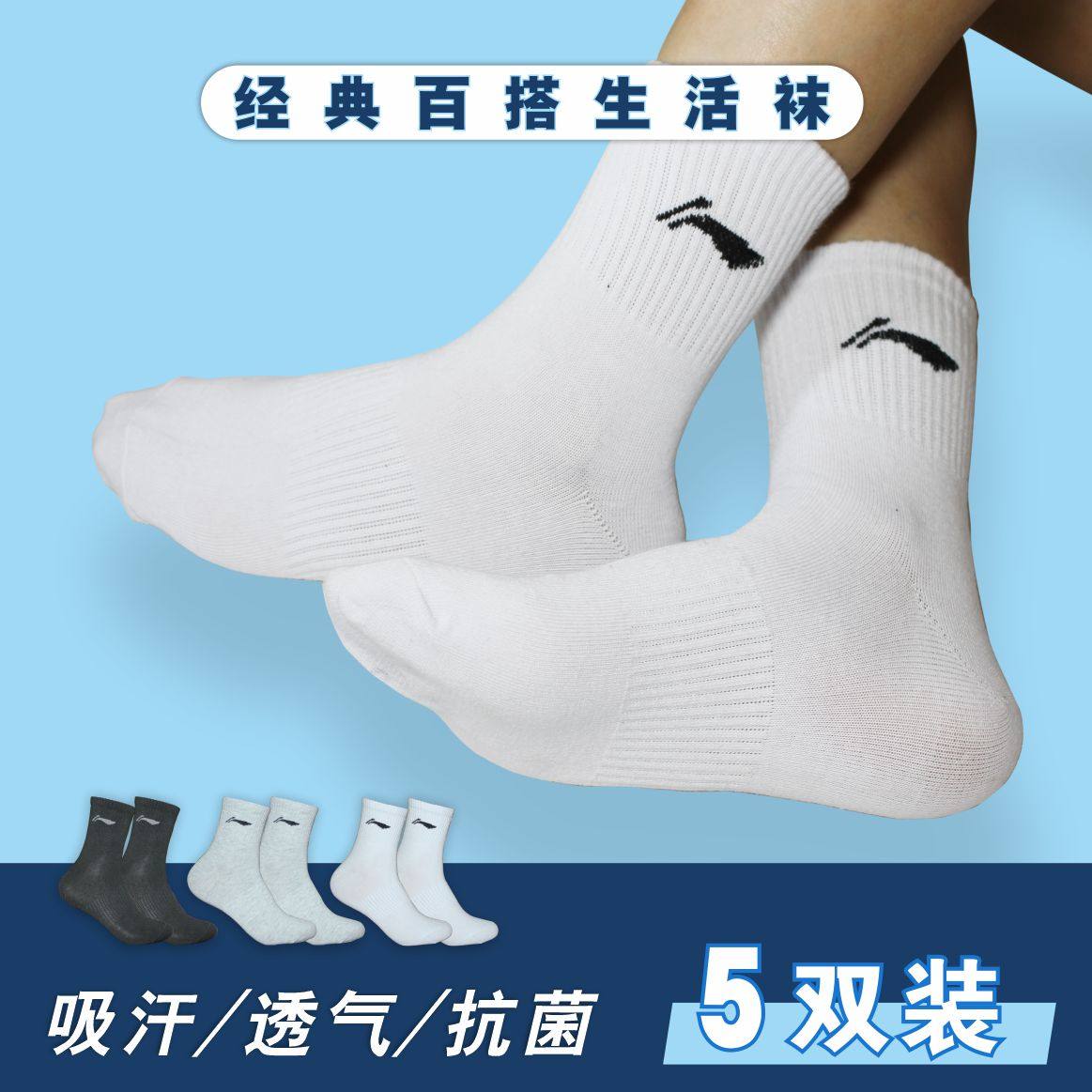 Lining李宁男女四季中筒黑白色跑步运动纯棉吸汗透气舒适防臭袜子