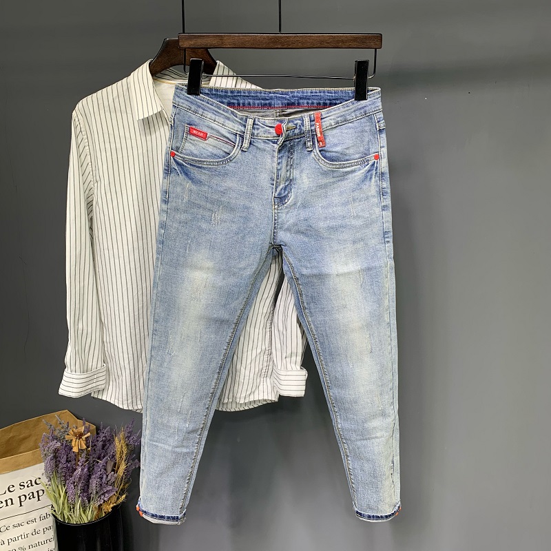 春季斜纹牛仔裤九分裤男夏季高端流行印花浅蓝色弹力修身小脚长裤