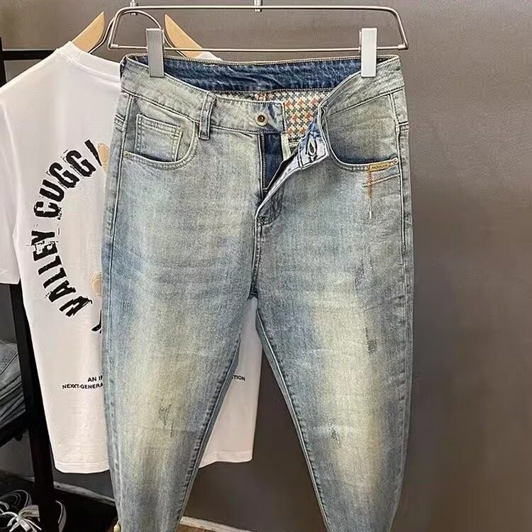 2025新款秋季潮牌男士牛仔裤九分裤锥形浅色做旧复古小脚哈伦裤薄