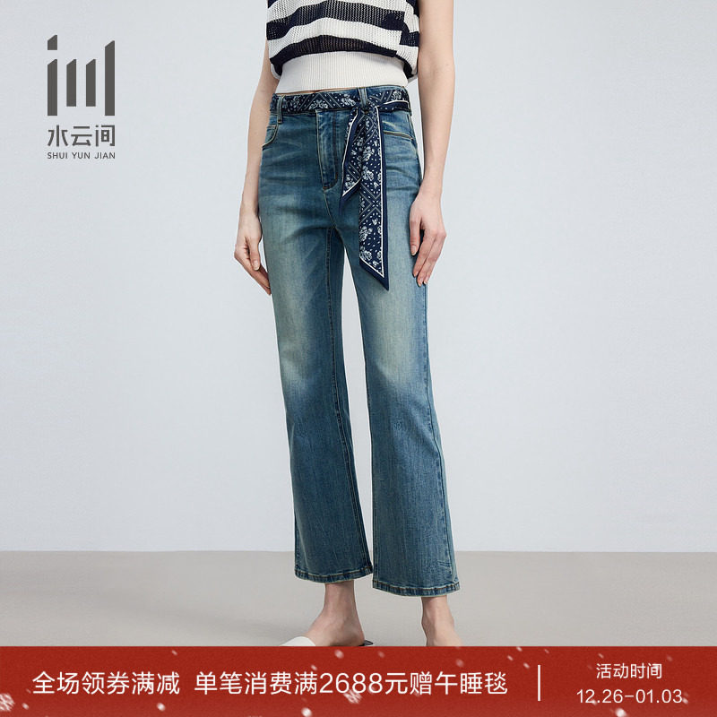 水云间女装 高腰复古丝带休闲裤微喇牛仔裤九分裤2025夏季新款