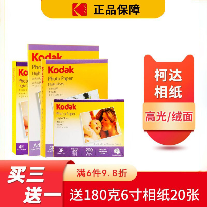 Kodak柯达相纸4R 6寸3R 5寸A4 A3高光相片纸防水喷墨照片打印纸照相纸180克200克230克光面7寸像纸270g绒面纸