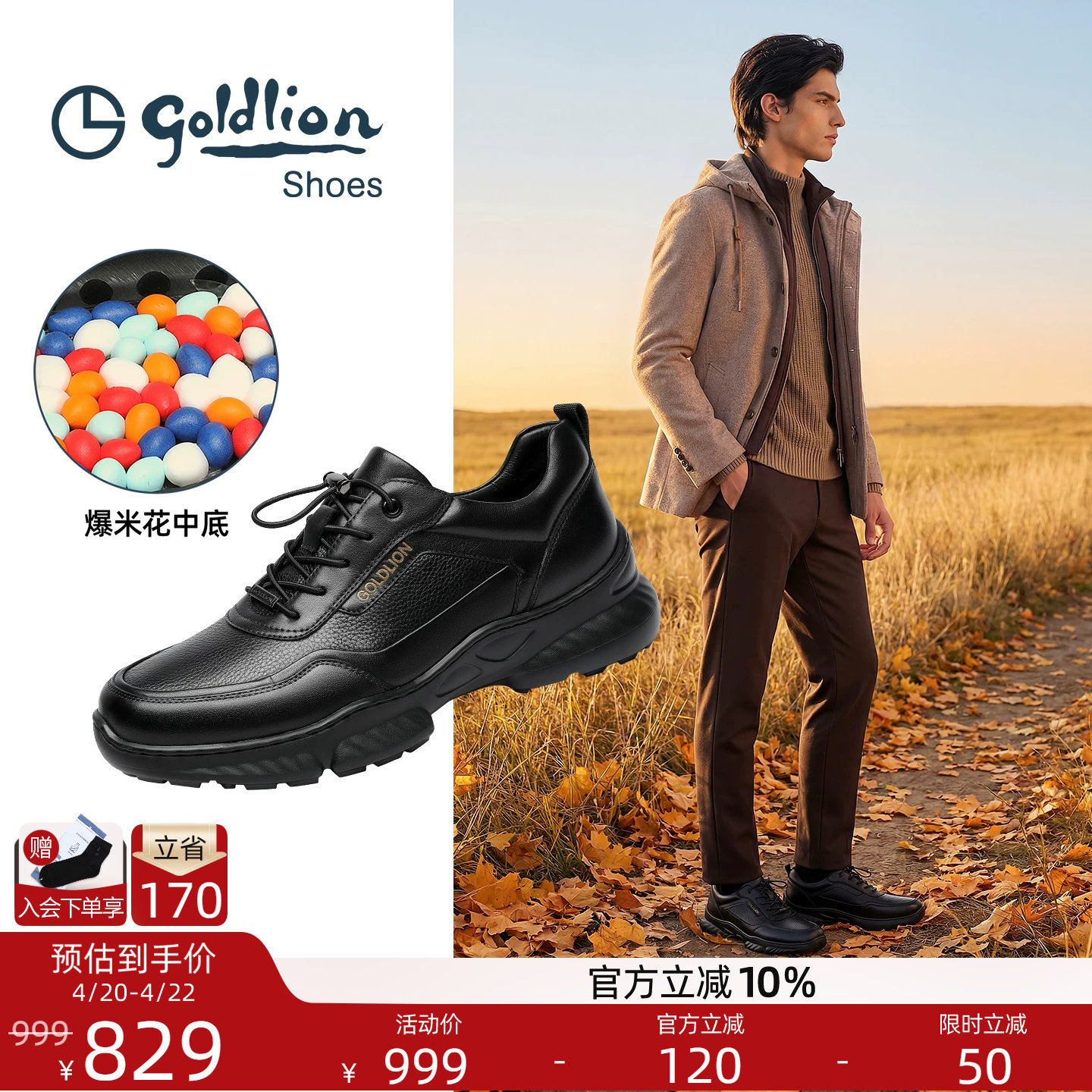 Goldlion男鞋官方正品夏季新款爆米花商务运动休闲鞋男士轻弹皮鞋