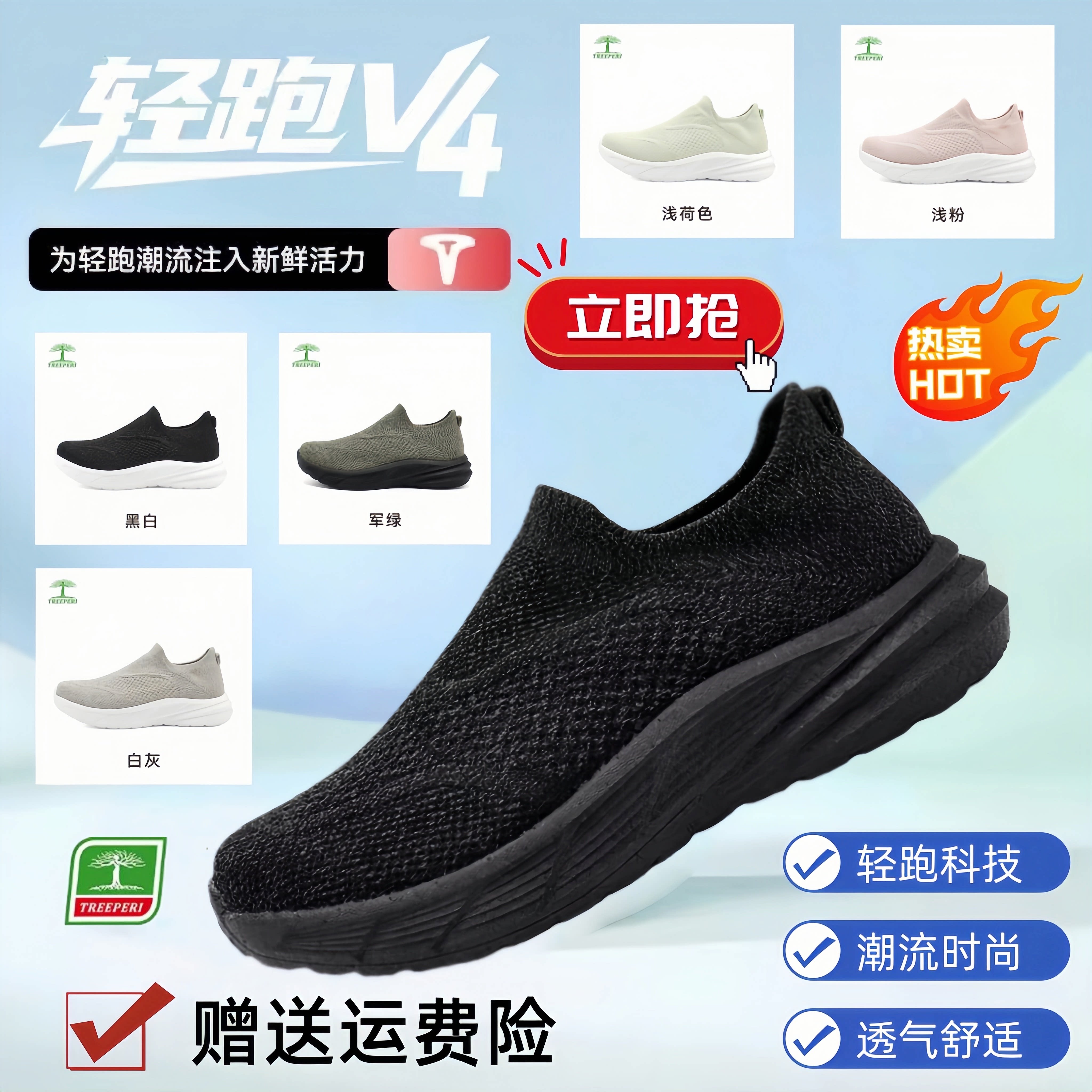 树标TREEPERI超轻V4透气爆米花男女款内增高健步一脚蹬防滑懒人鞋