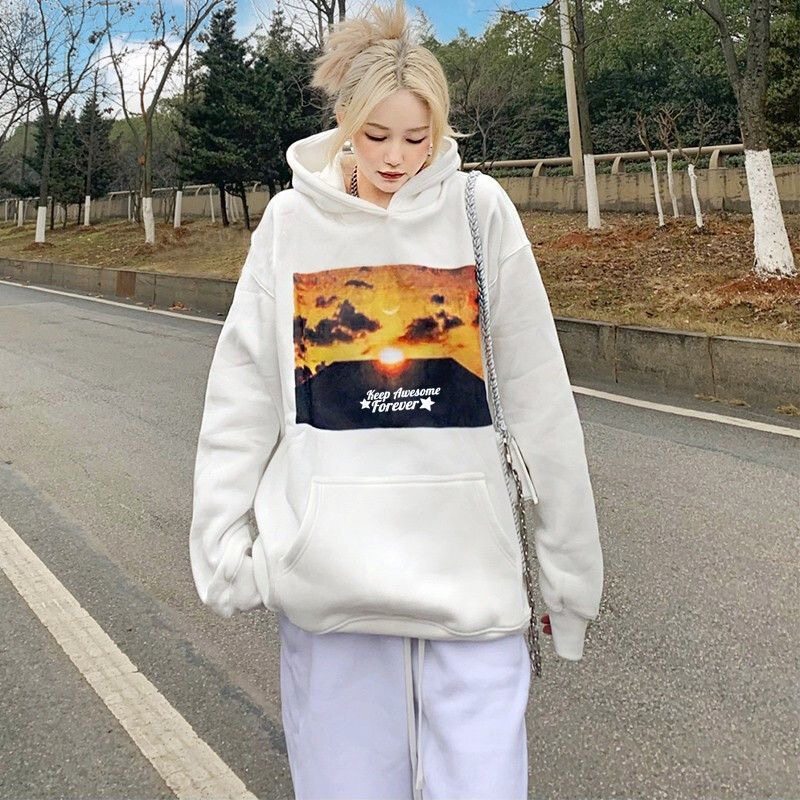 国潮炸街落日印花卫衣春季新款宽松韩版潮牌女款百搭高街情侣上衣
