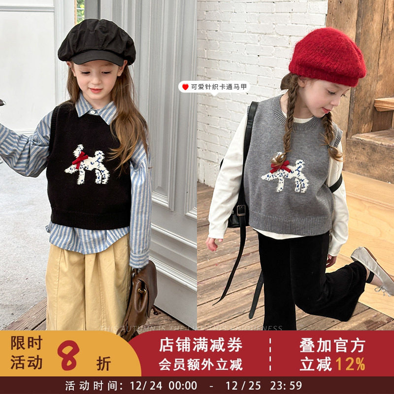 韩版秋装女童设计感立体蝴蝶结保暖套头针织背心儿童卡通小狗马甲