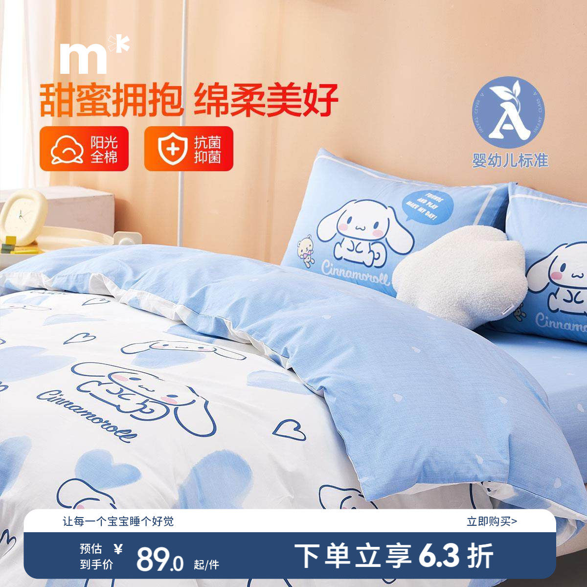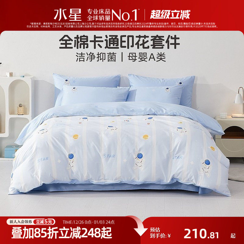 水星家纺母婴A类抑菌三/四件套全棉卡通套件儿童被套床单床笠床品