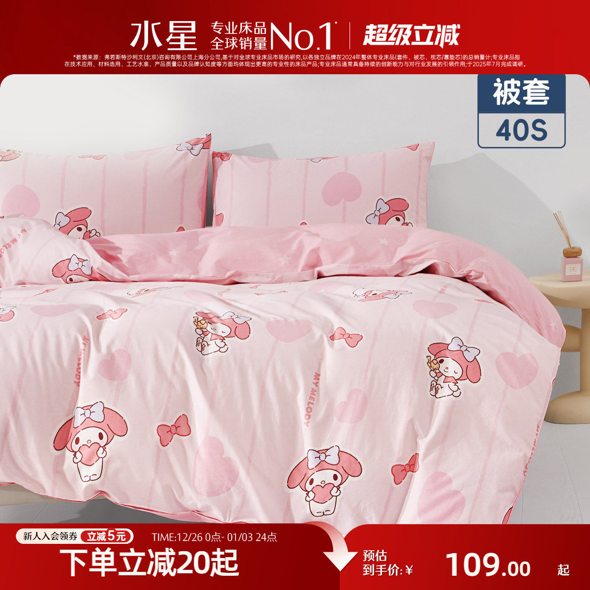 水星家纺全棉儿童被套单件母婴A类抑菌纯棉被子罩美乐蒂印花床品