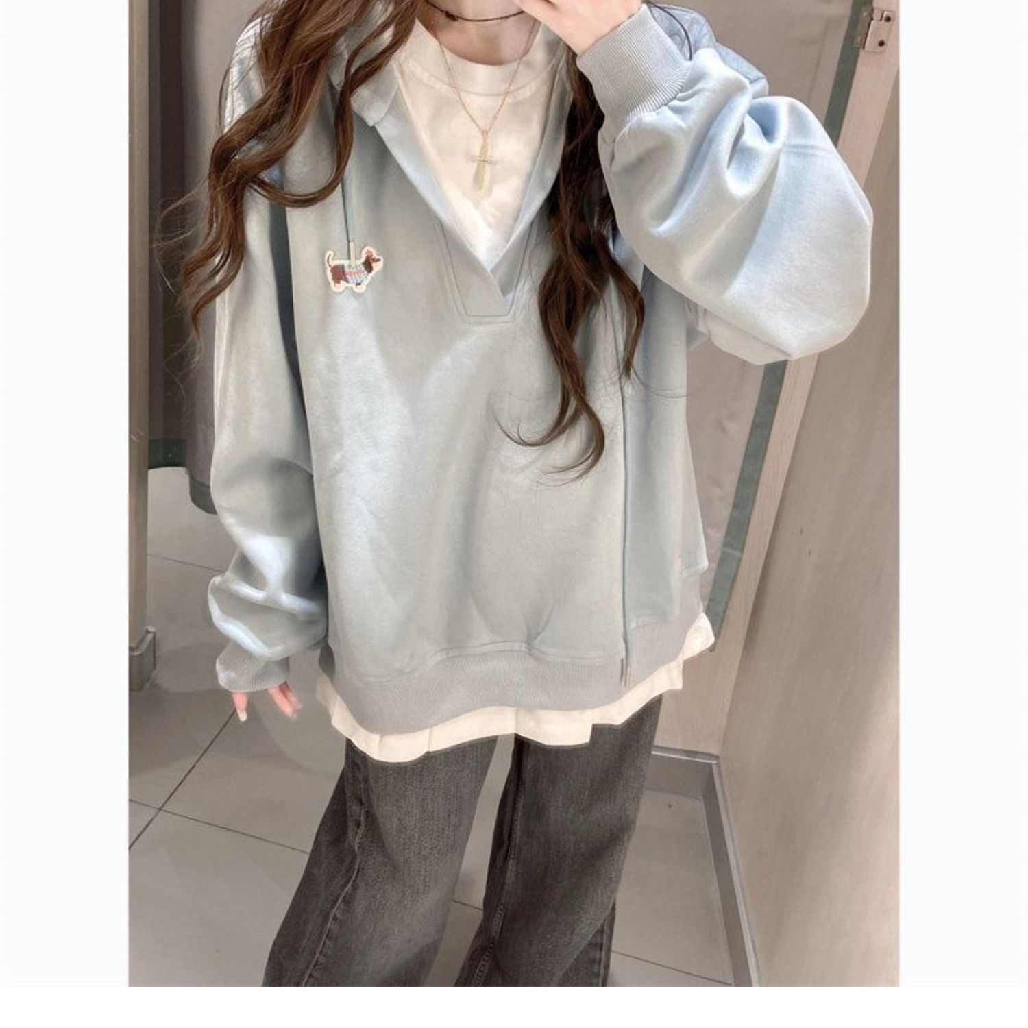 宅系学院风假两件腊肠狗连帽卫衣女秋季薄款宽松拼接套头帽衫外套