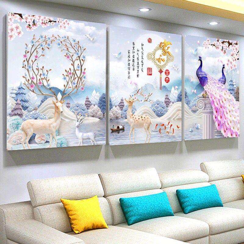 5d钻石画满钻2021新款客厅三联画孔雀麋鹿十字绣卧室点水晶钻石绣
